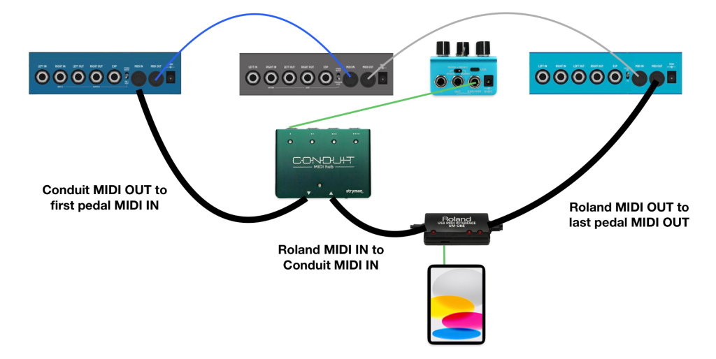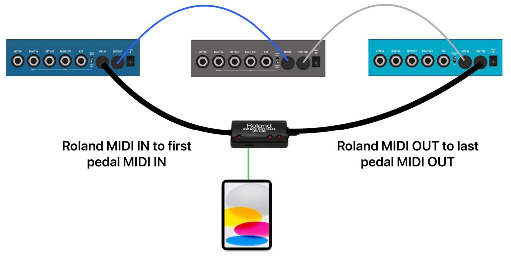 1 – You’ll need a MIDI interface to connect the pedals to the iPad or Android tablet, such as the Roland UM One MK2. You’ll probably need an adapter as well, either from USB-A to Lightning or USB-A to USB-C (I recommend using the Apple adapters). If you own a Strymon Conduit, DO NOT connect its USB port to the iPad. It won’t work. You’ll still need the Roland UM One (or equivalent) to connect from the Strymon Conduit to the iPad.
